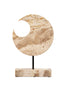This dramatic sculpture uses cream colored marble to reflect and respect the beauty of celestial objects. The intrinsic veining and shading of the natural stone nods to the rocky formations of our constant companions in the sky. They are sized to make a strong visual impact, and are a wonderful way to add height to any tabletop display. No two will be identical.