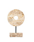 This dramatic sculpture uses cream colored marble to reflect and respect the beauty of celestial objects. The intrinsic veining and shading of the natural stone nods to the rocky formations of our constant companions in the sky. They are sized to make a strong visual impact, and are a wonderful way to add height to any tabletop display. No two will be identical.