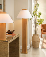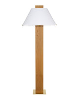 Anchoring a room with substance and presence, this artisan-hewn floor lamp rises from a hand-carved oak base set on a square of brushed brass. A visible armature mirrors that flash of warmth, while an oversized oak finial and a white linen cone shade complete the composition and softly diffuse the light. This lamp looks magnificent beside a leather sofa or in an entryway.