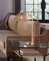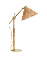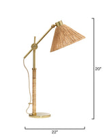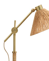 This adjustable table lamp practically begs you to relax beneath it with a cool drink and a spicy novel. Artisans craft the antiqued-brass base and hand-wrap it in natural abaca fiber, then pair it with an adjustable jute cone shade. A substantial base balances the delicate silhouette, while the lamp’s natural textures and materials add depth and authenticity to any space.