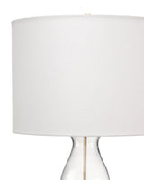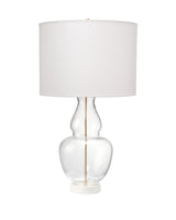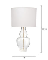 The delicacy of this gourd lamp’s hand-blown glass base is further elevated by a cloud-like, off-white linen drum shade that gently diffuses light while allowing the slim antique brass rod to remain subtly visible. Skilled artisans shape the heavy-weight glass with remarkable precision, grounding the piece on a smooth white marble disk and completing the design with a coordinating cylindrical brass finial that adds refinement and balance.