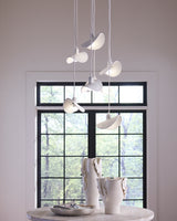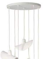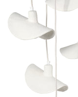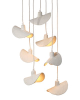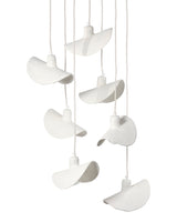 Part sculptural mobile and part chandelier, these visually stunning pieces are masterfully hand crafted and feature strong metal hardware for strength and durability. The seven pendants are created from multiple hand-applied and folded layers of papier mache, resulting in a graceful, ethereal look when hung singly, or serious drama when multiples are displayed over a large dining table or in an entry with soaring ceilings.