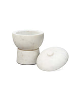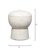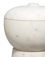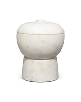 These expertly crafted marble containers celebrate the beauty of the natural stone from which they are carved. Here, Jamie honors the marble with the simplicity of her design, placing a softly rounded, lidded bowl on top of a pillar base to create some seriously chic storage! The white marble shines, highlighting and honoring its intrinsic veining, colors, and patterns, and ensuring that no two will be identical.