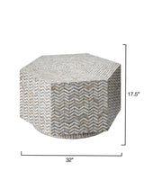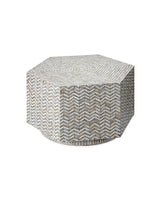 A jewel of the sea, Mother-of Pearl is a natural substance with rich luminescence, and each piece of it is unique. Small, multi-tonal strips of the iridescent material are carefully selected and expertly placed to create the intricate mosaics that cover every inch of these accent tables. Carefully contrasting their opulence with restraint, their geometrical shapes are kept deliberately simple.