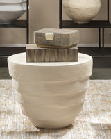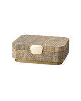 Beautiful bone is paired with woven raffia to create a decorative box of unusual beauty. Lined with beige ultra suede, it can store everything from extra chargers to treasured correspondences in style. With an easily integrated neutral palette and bold but simple design, it also makes an ideal addition to a desktop.