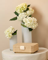 Beautiful bone is paired with woven raffia to create a decorative box of unusual beauty. Lined with beige ultra suede, it can store everything from extra chargers to treasured correspondences in style. With an easily integrated neutral palette and bold but simple design, it also makes an ideal addition to a desktop.