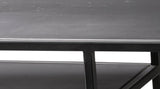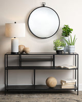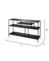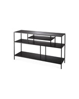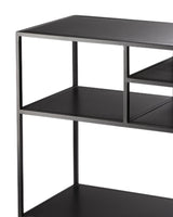 Black metal shelves and supports are asymmetrically arranged to create the perfect console or open-work media cabinet. The extra storage is great for displaying curated accessories or audio/visual necessities.