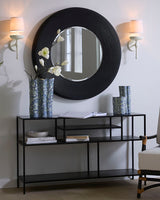 This metal console is intended to have a rustic appearance that may include spotting and variances in tone and luster.