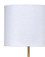 This handcrafted design was inspired by the elegance of the interiors Jamie experienced during travels through Italy, where travertine has been used since Roman times. No two pieces of the natural stone will be identical, and to highlight its beauty she chose a simple, softly curved bottle-shaped base. The warmth of the stone is accentuated by a long, slim neck and coordinating brass finial, both in gold. To keep the look clean and the focus on the travertine, she tops the lamp with a simple rolled edge drum shade in white linen.