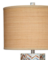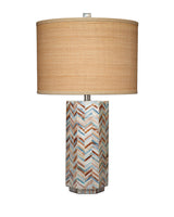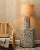 Luminous strips of mother-of-pearl are carefully arranged by hand to create the colorful mosaic that adorns the base of this supremely decorative table lamp. Topped simply with a mother-of-pearl finial and a classic raffia drum shade trimmed in linen, it is at once modern, casual, and welcoming and makes a superb addition to a home already full of life.