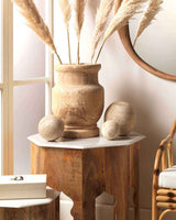Hand-carved: no two items will be exact in shape or overall height. Wood is an organic material with a natural wood grain that varies by cut. Each finish may be unique. Cracks may appear over time in the natural wood. Avoid exposure to water.
