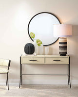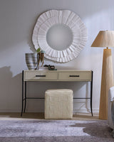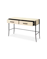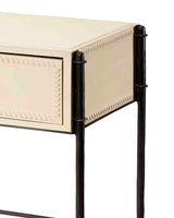 Off-white leather contrasts boldly with hand-forged iron in the artisan-crafted Nevado Console Table. Featuring two drawers that open smoothly for storage with iron pulls, elegantly sabered legs, and visible stitching for a touch of unexpected drama. Contemporary, with an Asian inspired edge and a subtle nod to Western style, this console table is perfect to display and store everything from your favorite lamp, candles or photos of your friends and family.