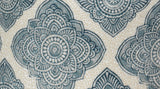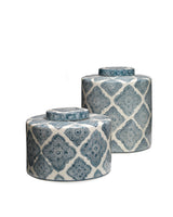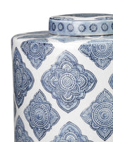 This cannister is a simple contemporary column shape in a sophisticated Arabic indigo pattern, repeated over a bone white porcelain background.
