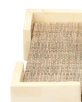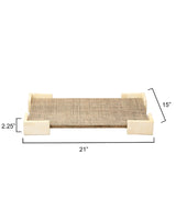 Beautiful bone is paired with woven raffia to create a decorative tray of unusual beauty. Lined with beige ultra suede, it can be piled with books or Topped with a collection of small decorative items. With an easily integrated neutral palette and bold but simple design, it also makes an ideal addition to a workspace.