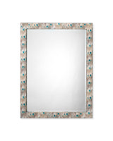Gorgeous, lacquered peacock patterns adorn the frame of this beveled wall mirror. The soft palette is accented with bright pops of blue and aqua, adding color and as a touch of glamour to any wall of your home. The frames are artisan created and the design will vary slightly from mirror to mirror.