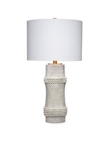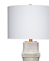A clean, contemporary take on a classic, the body of this lamp is a minimalistic interpretation of bamboo cane. Ours is unadorned but for a few carefully placed beaded embellishments. The lamps are each handcrafted of resin, with small splashes of brass courtesy of the metal hardware and finial. A white linen drum shade is included.