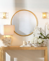 The perfect round mirror in a gold leaf finish is 36" diameter. It has a very clean profile and can work in modern, coastal, contemporary or transitional settings.