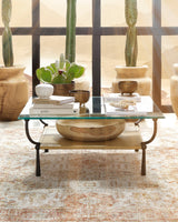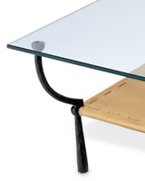 The focal point of this handsome accent table is the layer of rich, buttery camel leather. The softness of the leather contrasts superbly with the roughly hammered iron legs that anchor the piece. The legs rise up and then gently curl around to both cradles the leather and support the thick slab of strong glass that forms the table’s top. Finely crafted, this piece has a timeless look that never goes out of style.