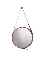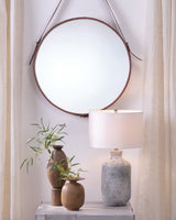 This gorgeous wall mirror brings the natural allure of rugged buff leather cowhide into your home as the frame and hanging strap of this fantastic wall mirror. The non-adjustable strap hangs from an included brass knob, a wonderful finishing detail.