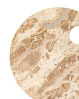 This dramatic sculpture uses cream colored marble to reflect and respect the beauty of celestial objects. The intrinsic veining and shading of the natural stone nods to the rocky formations of our constant companions in the sky. They are sized to make a strong visual impact, and are a wonderful way to add height to any tabletop display. No two will be identical.