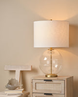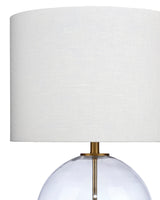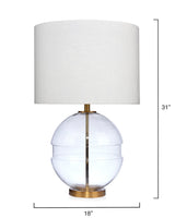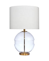 Metal and glass combine to create a table lamp that is both bold and delicate, from its metal base to its matching finial. The clear spherical glass surrounding the iron axis of the lamp is like a celestial body in orbit. This table lamp is both simple and sophisticated and finds itself at home on a console, living room table, dining buffet, or anywhere else that needs a touch of uniquely elegant decor.