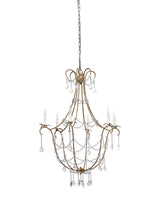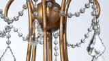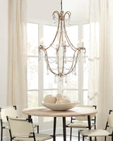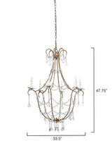 This large chandelier screams "glamorous" from the tip of the champagne ironwork to the ends of the cut crystal jewels dripping below. Chains of crystal beading are woven and draped among the scrolling structure and include over twenty dangling crystal jewels. Six faux dripping candles are perched in iron blooms, giving this fixture a subtle botanical touch. This chandelier will bring a touch of delicate drama to your dining room, bedroom, or entryway. The fixture is suspended from a coordinating 3.5-foot chain in champagne, and professional installation is recommended.