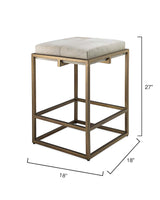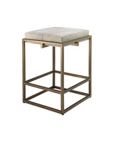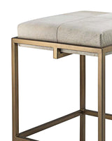 An architectural metal framework makes a clean, yet modern statement. The Shelby Bar Stool is an Art Deco inspired seat with geometric bars and a white hide cushion. The antiqued brass has a polished finish to give it a subtle luster.