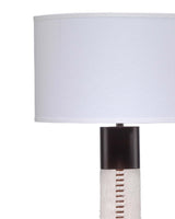 Warm oil rubbed bronze is wrapped in white hair-on hide in this exceptional lighting option. The hides for each are selected by hand; no two hides will be identical. Their masculine edge is enhanced with a bronze finial and softened with an off-white linen drum shade, resulting in a unique choice for study, living area, or den.