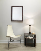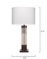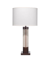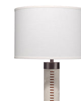 Warm oil rubbed bronze is wrapped in white hair-on hide in this exceptional lighting option. The hides for each are selected by hand; no two hides will be identical. Their masculine edge is enhanced with a bronze finial and softened with an off-white linen drum shade, resulting in a unique choice for study, living area, or den.