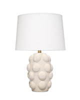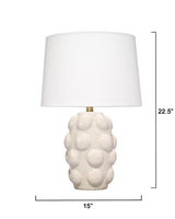 Texture takes center stage in this white-on-white table lamp, featuring a cream ceramic body adorned with a hand-applied crackle effect and playful bubble-like embellishments. The subtly textured white linen drum shade is elegantly finished with a neatly rolled edge. This bright and fun accent is perfect for illuminating any décor.