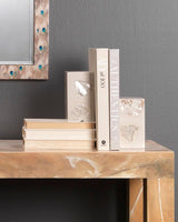 This set of two bookends has been formed of natural mica and resin. Created to showcase the beauty of the natural crystal encased within each block, no two will be the same. These make an absolutely stunning addition to any bookshelf or mantle and come in light and dark options: gray mica with clear resin or clear mica with pearl resin.