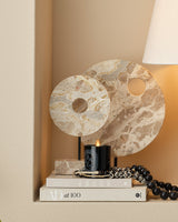 This dramatic sculpture uses cream colored marble to reflect and respect the beauty of celestial objects. The intrinsic veining and shading of the natural stone nods to the rocky formations of our constant companions in the sky. They are sized to make a strong visual impact, and are a wonderful way to add height to any tabletop display. No two will be identical.