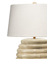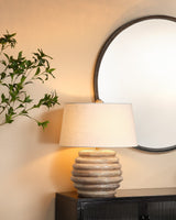 Inspired by both the golden ratio and 14th century counting devices, this hand-carved mango wood table lamp exudes a simple warmth. The sustainable hardwood base is given a natural bleached finish and is topped with a tapered shade in linen and a coordinating wood finial. It is ideal for a casual chic décor, and is especially striking when displayed in pairs.