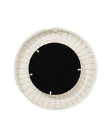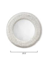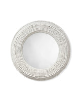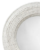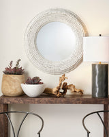 Hundreds of hand carved wood beads are arranged one at a time, by size and shape, to form the glorious frame that surrounds this round wall mirror. The wood is either naturally finished, allowing the intrinsic grains and striations of each piece of wood to become a part of the design, or given a clean white finish, keeping the look breezy and casual. As no two beads will be the same, no two mirrors will be identical.