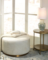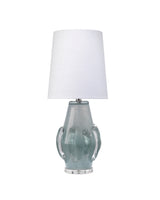The Talon Collection table lamp’s handblown art glass base is topped with a clean white linen cone shade and an acrylic ball finial and an acrylic base. Available in cornflower blue or clear glass, each is elaborately adorned with thick “ribbons” of more handblown glass around the lamps body. True works of art; no two will be identical.