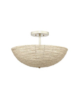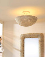 Influenced by both driftwood chunks and beads of beach glass, Jamie’s design brings elements of each to this lovely ceiling fixture. Handcrafted of hundreds of small, smooth mango-wood beads that completely obscure the strong iron frame within, the look is cool, casual, and coastal.