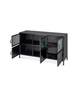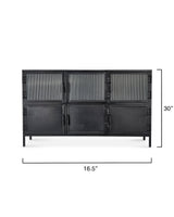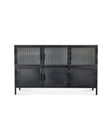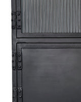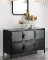 With an abundance of storage and tons of style, this industrial-edged console is ideal for an urban, contemporary décor. Handcrafted of minimally finished black metal, its six doors open to reveal ample cupboard space and one fixed shelf. Three of the doors are in a richly textural ribbed glass. The bottom three are solid metal. All six open easily with hand-forged iron pulls.
