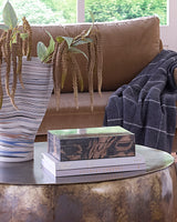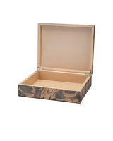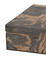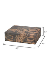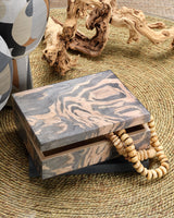 Rich brown and navy faux wood grain patterns embellish this artisan-crafted box, which is covered in layers of hand-applied lacquer. Strong metal hinges allow easy access to storage for small treasures, everyday items, or collectibles. Each side is elegantly finished, highlighting meticulous craftsmanship. The box balances functionality and style, providing a sophisticated accent that enhances any room while offering practical organizational benefits.