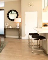 An architectural metal framework makes a clean, yet modern statement. The Shelby Bar Stool is an Art Deco inspired seat with geometric bars and a white hide cushion. The antiqued brass has a polished finish to give it a subtle luster.