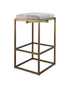 An architectural metal framework makes a clean, yet modern statement. The Shelby Bar Stool is an Art Deco inspired seat with geometric bars and a white hide cushion. The antiqued brass has a polished finish to give it a subtle luster.