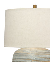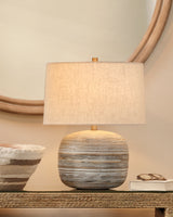 Supremely casual yet eminently approachable, this artisan-crafted table lamp adds warmth and style to any décor. A generously sized bamboo base gives the piece an earthy appeal, and artisans enhance the effect with a hand-applied whitewash finish. Burnished antiqued-brass hardware and a soft, natural linen drum shade complete the composition. Place it on an entryway console to welcome guests with gracious charm.
