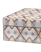 The design on this box is taken from photos of agate repeated in a way that gives the impression of looking through a kaleidoscope. The hand applied gold leafing adds another layer to create this incredible finish.