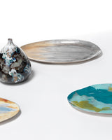 Organically shaped and inspired by the colors of nature, this collection of metal trays each feature vibrant, swirled patterns in enamel. Safe for use with dry foods, they’re a supremely decorative option for serving snacks, filling with décor balls, or simply displaying.