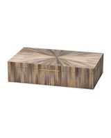 Artisans create the exuberant starbursts on these boxes from thin strips of straw in variegated natural tones. Each opens easily on a quadrant hinge to reveal a generous interior lined with chambray fabric. Underneath is a brown suede lining. With its lux interpretation of mid-century design and its decidedly tropical aesthetic, this is refined storage worthy of any treasure that needs to be stylishly stashed.