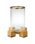 Edgy, elemental materials balance the softness of a candle’s glow in this contemporary take on a classic hurricane. A thick cylinder of hand-blown glass protects the candle’s fragile flame and is itself supported by a base covered in rich and creamy cashew or ivory leather. The top and bottom are banded in burnished brass. Customize the look with your own candle; try an ivory pillar for a monochromatic effect, or use a colored candle to coordinate with your décor.
