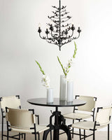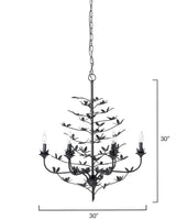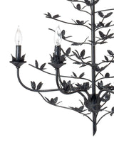 The structure of this chandelier was inspired by the natural beauty of foliage in bloom. Every branch of the black chandelier has its own blooming petals, each crafted and attached by hand. Six iron arms hold faux dripping candlesticks blooming out of delicate iron petals. This eye-catching piece of art is expertly handcrafted and will add dramatic flair to your home's decor. The fixture is suspended from a coordinating 44" chain in black iron or rust iron, and professional installation is recommended.