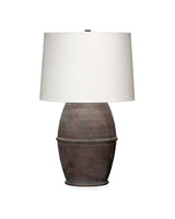 This large table lamp introduces an earthy tone and texture to a classic silhouette. The unique detail of a thin raised band draws attention to the body's midline, and the rustic brown ceramic of the lamp's oversized body contrasts well with its clean white linen drum shade. This lamp is sure to make a substantial statement anywhere in your home, like an entry console or a dining room buffet.