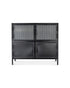 With an abundance of storage and tons of style, this industrial-edged side table is ideal for an urban, contemporary décor. Handcrafted of minimally finished black metal, its four doors open to reveal ample cupboard space and one fixed shelf. Two of the doors are in a richly textural ribbed glass. The bottom two are solid metal. All six open easily with hand-forged iron pulls.