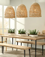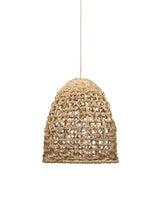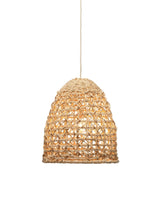 The rusticity of this coastally inspired pendant is tempered with upscale elements like a coordinating wrapped cloth cord. The natural fraying and slight color variations found in the corn straw rope used to create it make each lamp unique, and a one-of-a- kind tropical treasure.