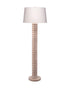 Masterfully carved of mango wood, this attractive, uncomplicated floor lamp was inspired by the beads on ancient counting devices. The bleached finish on the wood base is slightly textured and semi sheer, revealing the beauty of the sustainable hardwood beneath. Each is Topped with a drum shade in a light natural poly linen and a coordinating wood finial.